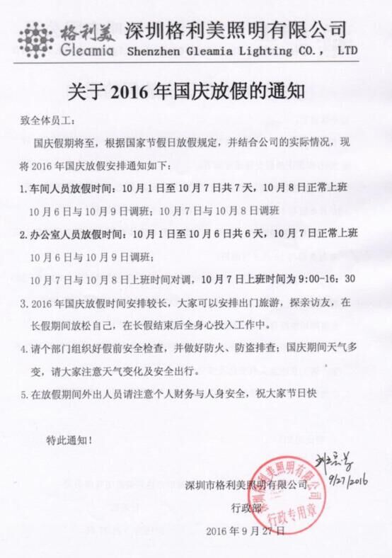 格利美照明2016年國(guó)慶節(jié)放假通知