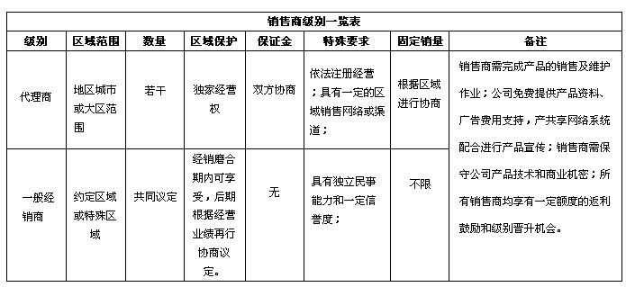 銷(xiāo)售商的要求、利益及責(zé)任說(shuō)明: 根據(jù)目前本公司的市場(chǎng)運(yùn)作體系,將銷(xiāo)售商分為代理商、一般經(jīng)銷(xiāo)商共二類(lèi) :